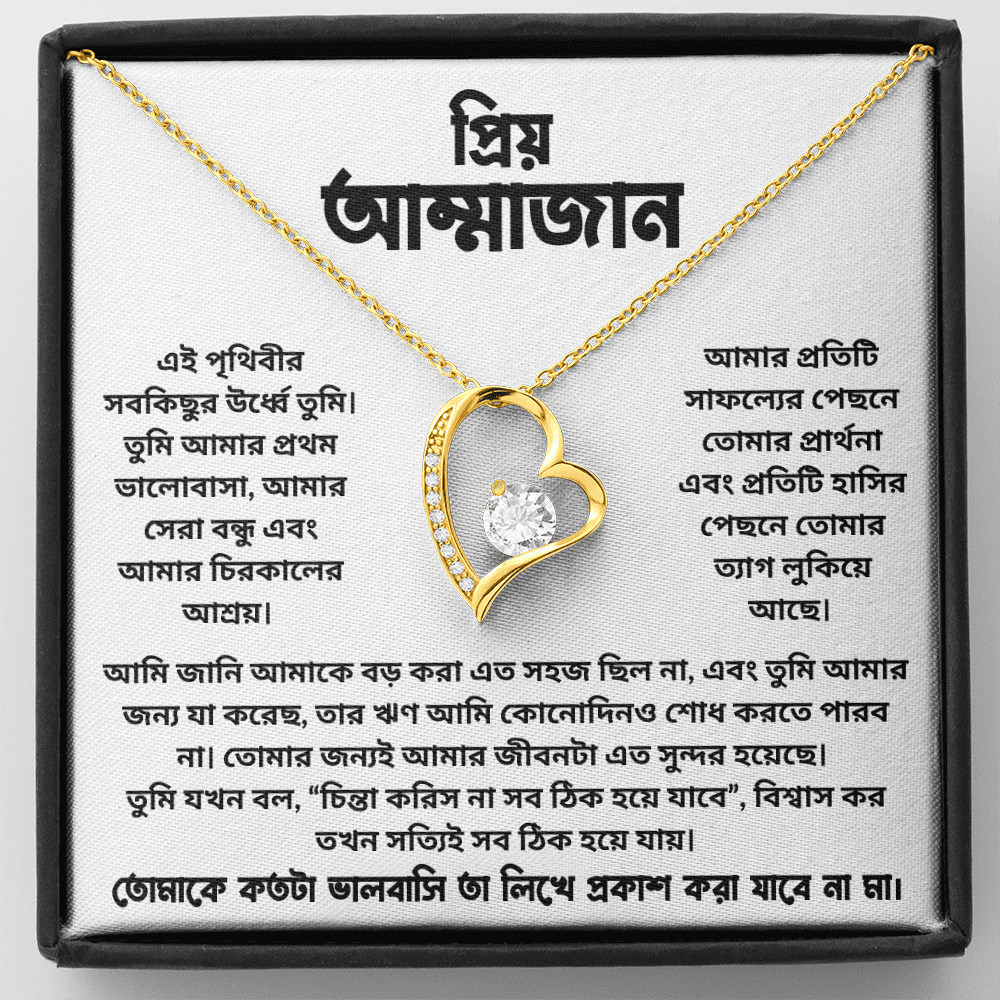 এই গিফট বক্সটি শুধু একটি নেকলেস নয়, এটি আপনার না বলা কথাগুলোর প্রতিচ্ছবি। এর সাথে থাকা বাংলা ম্যাসেজ কার্ডের প্রতিটি শব্দ আপনার হয়ে আম্মাজানকে বলবে, তিনি আপনার জীবনে কতটা মূল্যবান। এটি এমন এক উপহার, যা তিনি সারাজীবন আগলে রাখবেন।