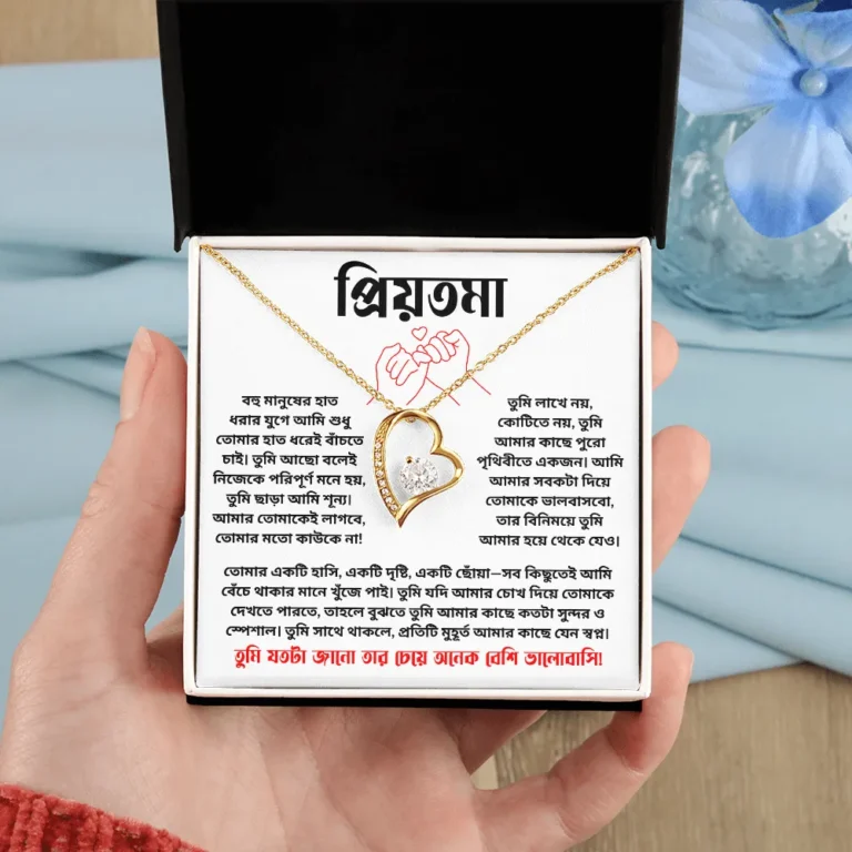 এই চমৎকার লাভ হার্ট নেকলেসটি শুধু একটি গিফট নয় – এটি একটি অনুভূতি, একটি স্মৃতি, একটি প্রেমের প্রকাশ! যখন আপনার প্রিয় স্ত্রী এই গিফট বক্সটি খুলে ইমোশনাল ম্যাসেজটি পড়বে, তার মুখে যে হাসি ফুটবে – তা আপনি কখনো ভুলবেন না।