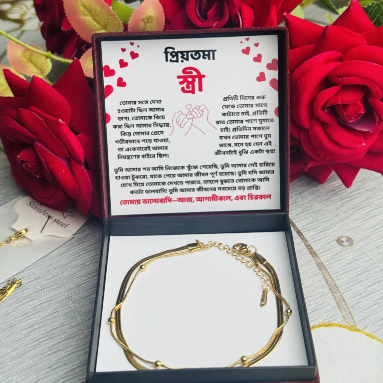 এই চমৎকার পায়েলগুলো শুধু একটি গিফট নয় – এটি একটি অনুভূতি, একটি স্মৃতি, একটি প্রেমের প্রকাশ! যখন আপনার প্রিয় স্ত্রী এই গিফট বক্সটি খুলে ইমোশনাল ম্যাসেজটি পড়বে, তার মুখে যে হাসি ফুটবে – তা আপনি কখনো ভুলবেন না।