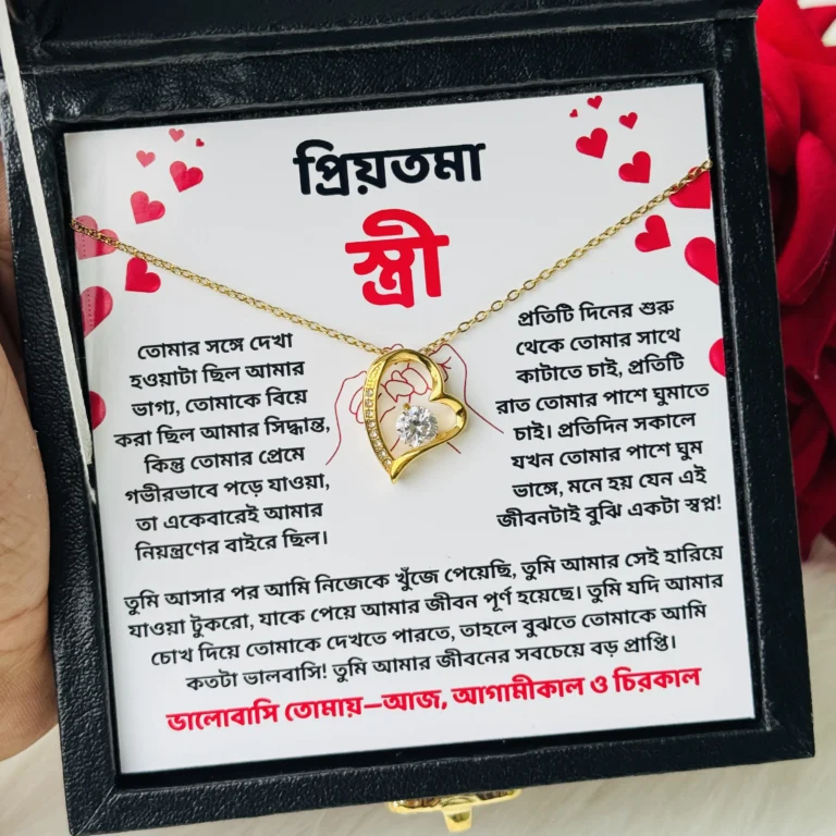 এই চমৎকার লাভ হার্ট নেকলেসটি শুধু একটি গিফট নয় – এটি একটি অনুভূতি, একটি স্মৃতি, একটি প্রেমের প্রকাশ! যখন আপনার প্রিয় স্ত্রী এই গিফট বক্সটি খুলে ইমোশনাল ম্যাসেজটি পড়বে, তার মুখে যে হাসি ফুটবে – তা আপনি কখনো ভুলবেন না।