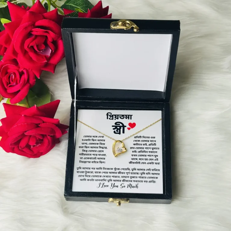 এই চমৎকার লাভ হার্ট নেকলেসটি শুধু একটি গিফট নয় – এটি একটি অনুভূতি, একটি স্মৃতি, একটি প্রেমের প্রকাশ! যখন আপনার প্রিয় স্ত্রী এই গিফট বক্সটি খুলে ইমোশনাল ম্যাসেজটি পড়বে, তার মুখে যে হাসি ফুটবে – তা আপনি কখনো ভুলবেন না।